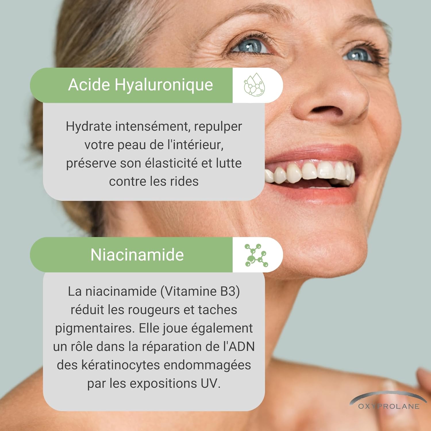 - RÉDUIT L’APPARITION DES RIDES : Oxyprolane HA apporte l’hydratation idéale afin de ralentir le processus de vieillissement de la peau. La peau est mieux hydratée et mieux oxygénée de l’intérieur.