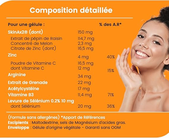 SkinAx2 150mg, Zinc 4 mg, Poudre de Vitamine C 16,5mg, Arginine 34mg, Extrait de Grenade 22 mg, Vitamine B3 11,4 mg , Levure de Sélénium 0.2% 10 mg