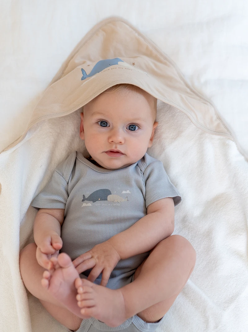 Faites du bain un moment ludique et agréable avec notre cape de bain baleine, douce et amusante pour envelopper bébé dans un cocon.